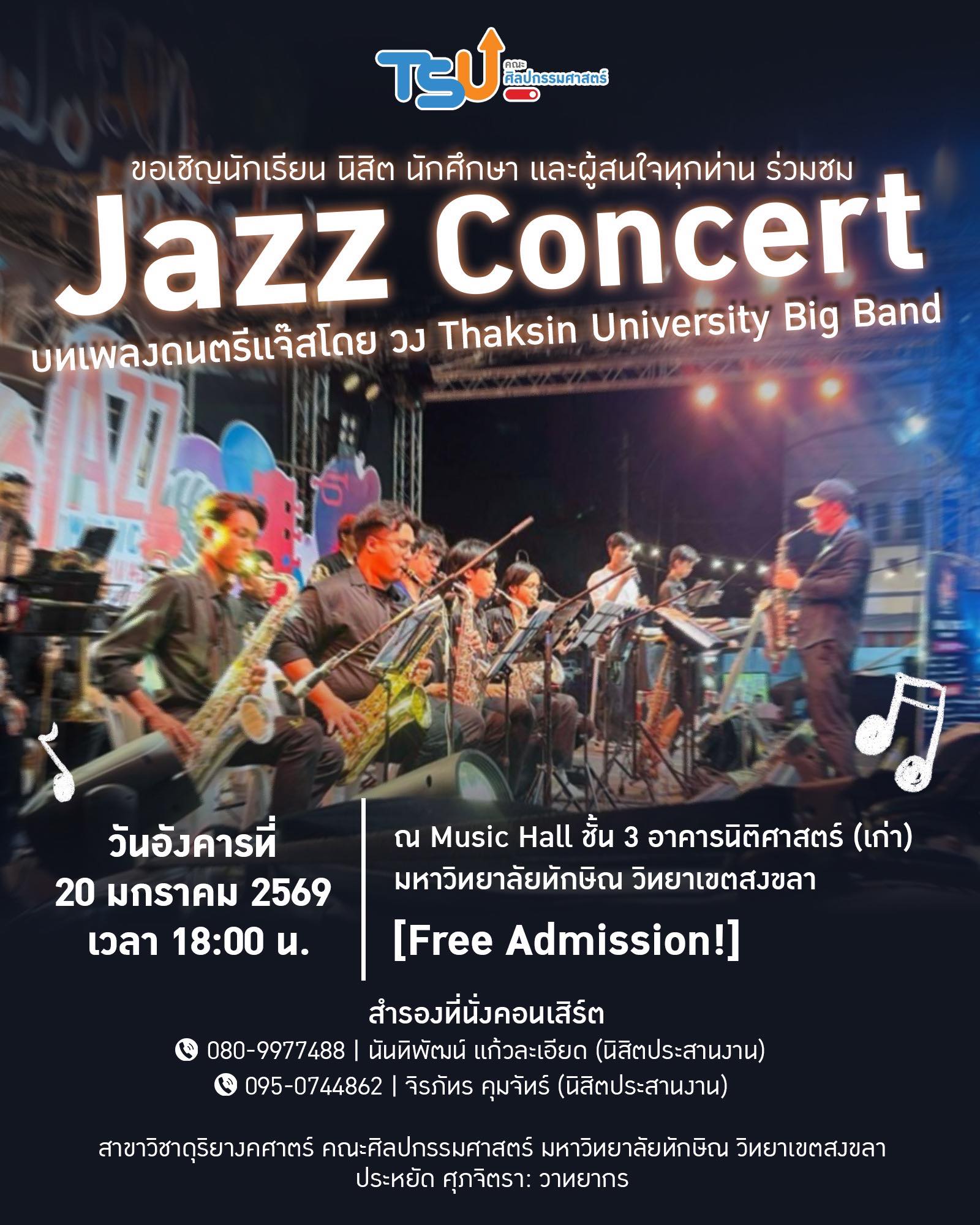 ขอเชิญชม JAZZ CONCERT บทเพลงดนตรีแจ๊สโดย วง Thaksin University Big Band