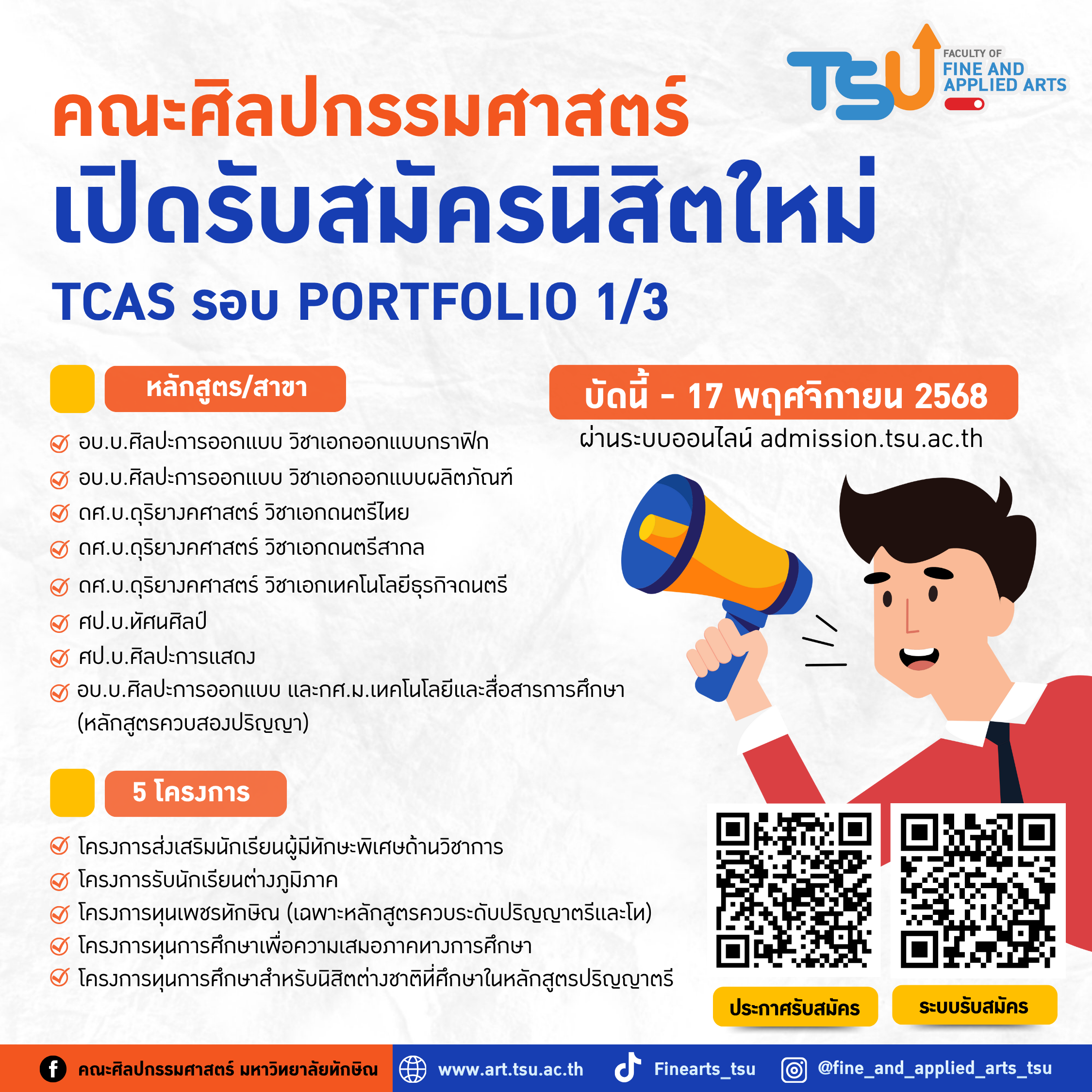 คณะศิลปกรรมศาสตร์ มหาวิทยาลัยทักษิณ เปิดรับสมัครนิสิตใหม่ ประจำปีการศึกษา 2569 TCAS รอบ Portfolio 1/3