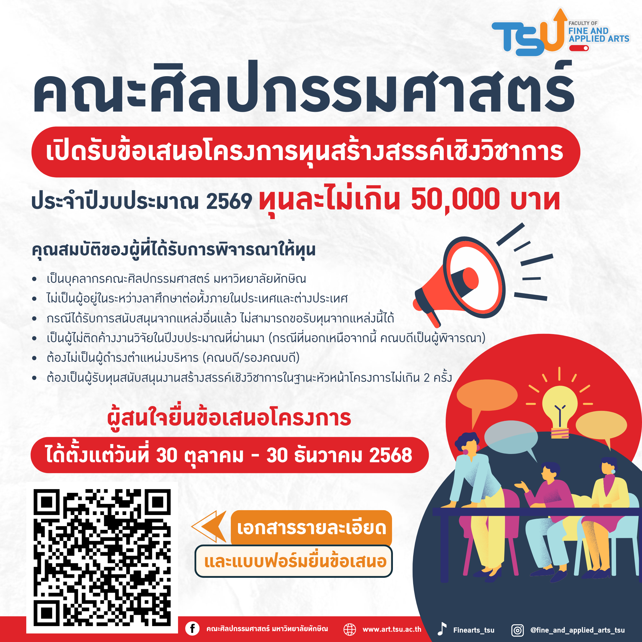 คณะศิลปกรรมศาสตร์ เปิดรับข้อเสนอโครงการทุนสร้างสรรค์เชิงวิชาการ ประจำปีงบประมาณ 2569 ทุนละไม่เกิน 50,000 บาท