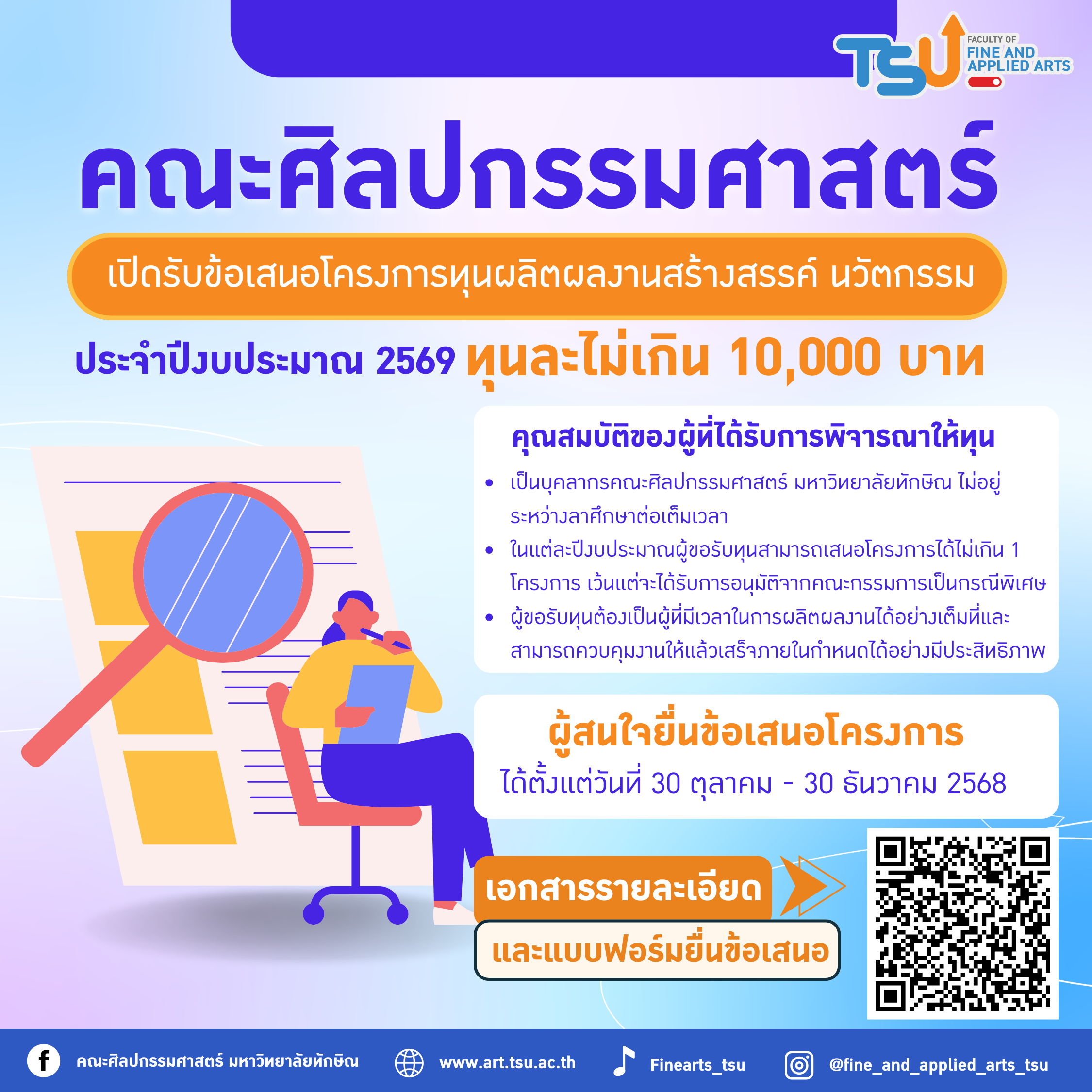 คณะศิลปกรรมศาสตร์ เปิดรับข้อเสนอโครงการทุนผลิตผลงานสร้างสรรค์ นวัตกรรม ประจำปีงบประมาณ 2569 ทุนละไม่เกิน 10,000 บาท