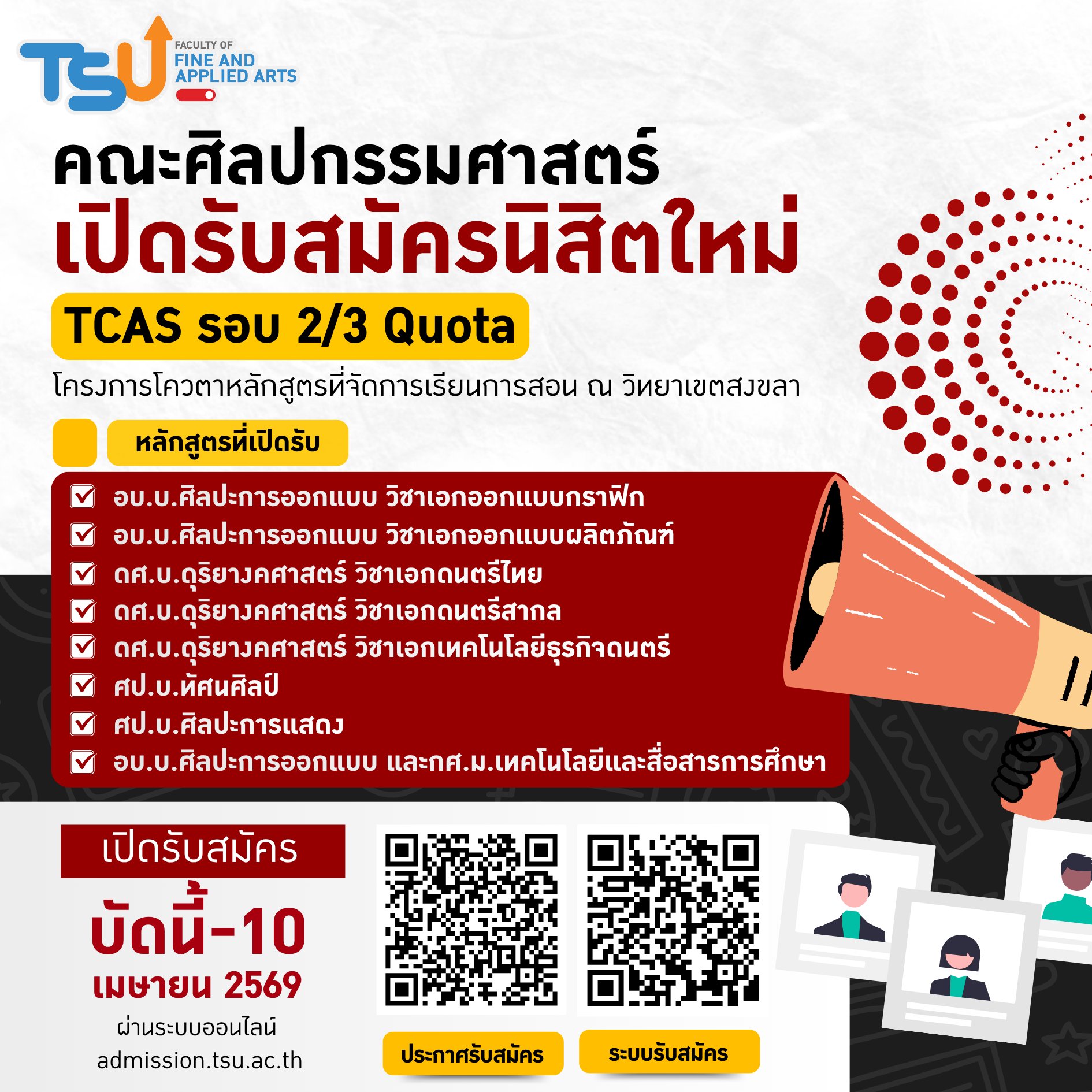 คณะศิลปกรรมศาสตร์ มหาวิทยาลัยทักษิณ เปิดรับสมัครนิสิตใหม่ ประจำปีการศึกษา 2569 TCAS รอบ 2/3 Quota